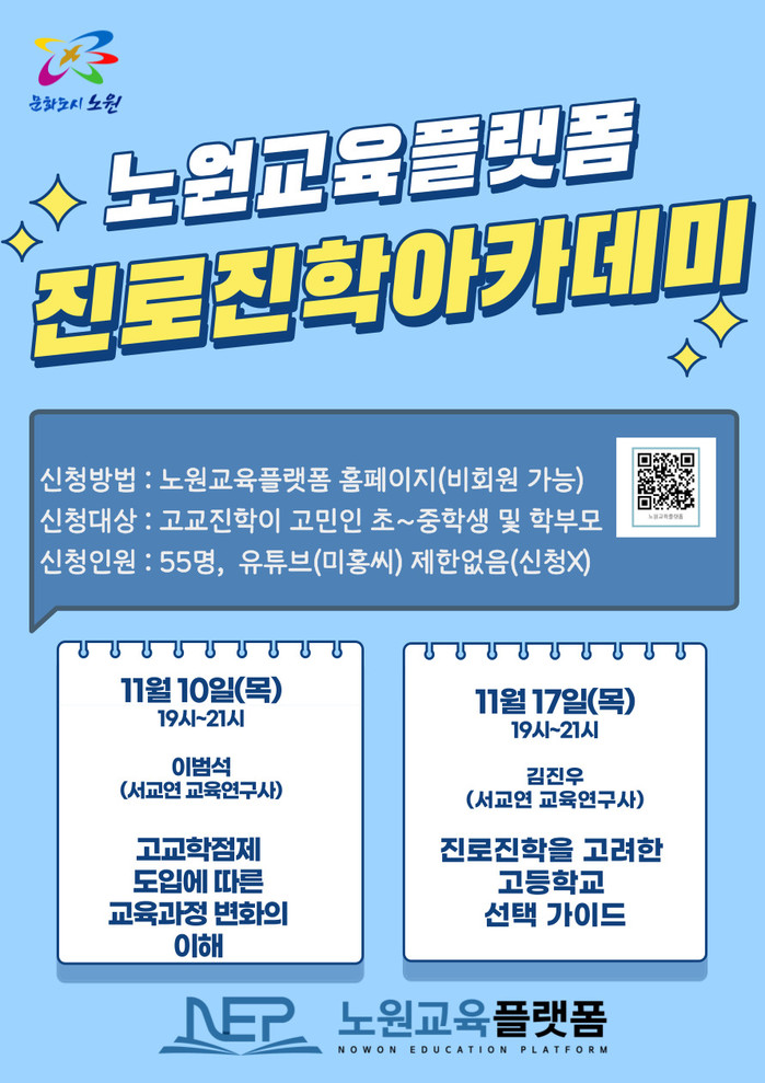 [시민일보 = 홍덕표 기자] 서울 노원구(구청장 오승록) 오는 10·17일 양일간 노원교육플랫폼 대강의실에서 고등학교 진학을 주제로 진로진학아카데미를 개최한다.