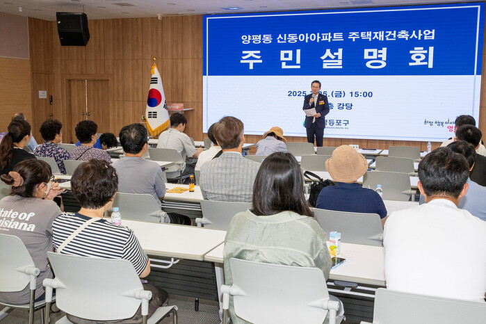 영등포구가 최근 별관 대강당에서 양평동 신동아아파트 주택재건축사업 주민설명회를 진행했다. 사진은 설명회에 참석한 최호권 구청장이 발언하고 있는 모습. (사진=영등포구청 제공)