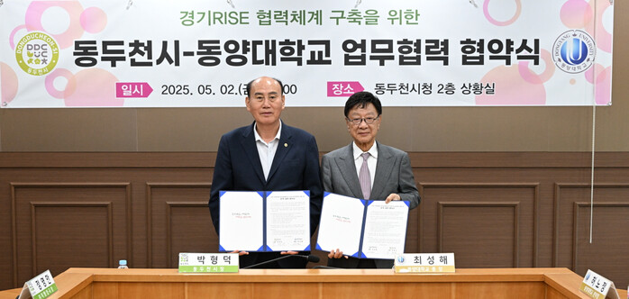 경기 동두천시가 최근 시청 상황실에서 동양대학교와 RISE(지역혁신 중심 대학 지원체계) 사업 추진을 위한 업무 협약을 체결했다. 사진은 박형덕 시장(왼쪽)이 최성해 총장과 기념촬영을 하고 있는 모습. (사진=동두천시청 제공)