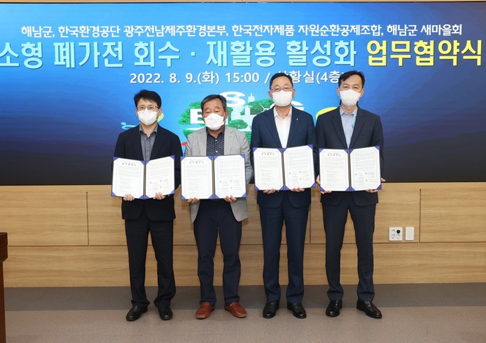 [해남=정찬남 기자] 전남 해남군은 한국환경공단 광주전남제주환경본부, 한국전자제품자원순환공제조합, 해남군 새마을회와 소형 폐가전제품 수거체계 구축을 위한 업무협약을 체결했다.