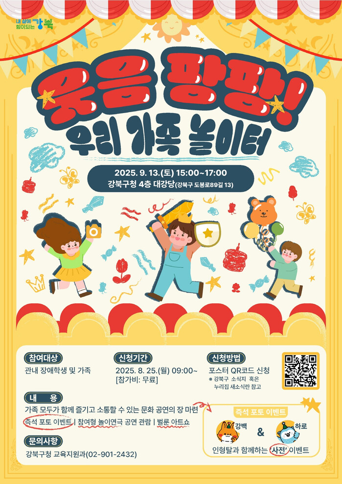 [시민일보 = 문민호 기자] 서울 강북구(구청장 이순희)는 오는 9월13일 오후 3~5시 강북구청 4층 대강당에서 장애학생과 가족이 함께하는 문화체험 행사 ‘웃음 팡팡! 우리 가족 놀이터’를 개최한다.