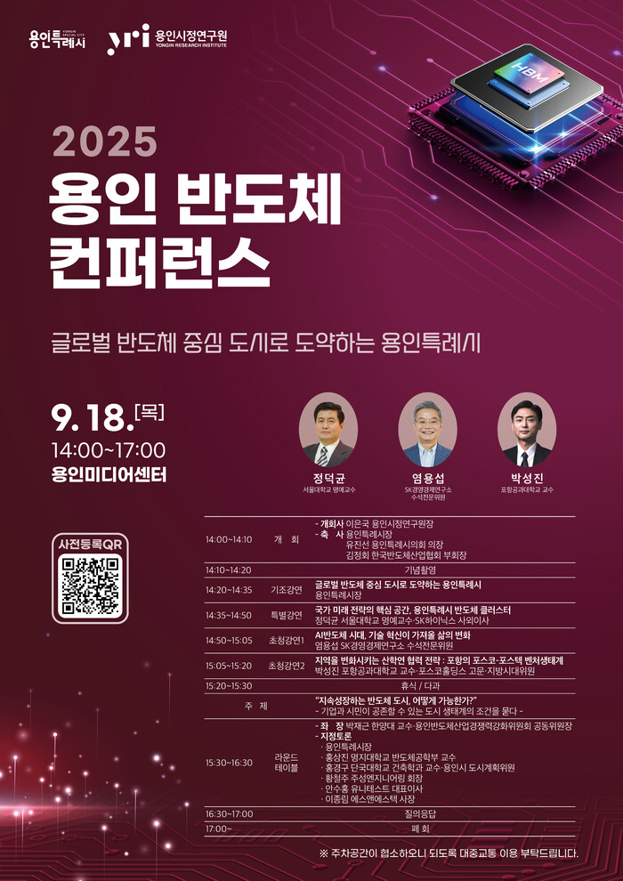 [용인=오왕석 기자] 용인특례시(시장 이상일)는 재단법인 용인시정연구원과 함께 18일 오후 2시 용인미디어센터에서 ‘2025 용인 반도체 컨퍼런스’를 연다고 11일 밝혔다.