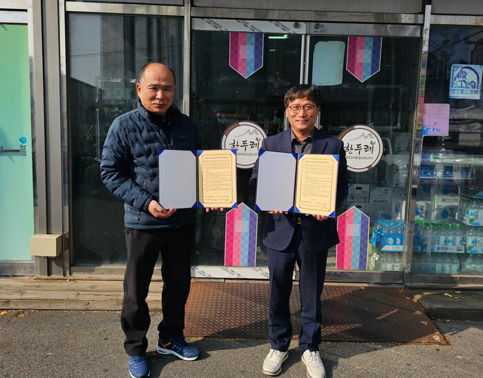 | ▲ 원산동, 행복푸드나눔가게 업무 협약 체결(임점식 대표 우측 황성용 동장)(출처=목포시) |