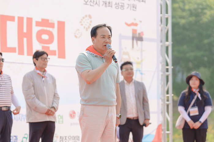 경기 오산시가 최근 오산천 일원에서 3200여명이 참여한 가운데 ‘2025 오!산뜻한 오산천 걷기대회’를 성황리에 개최했다. 이번 대회는 ‘생태와 휴식이 흐르는 길’이라는 슬로건 아래 진행됐다. 사진은 대회에서 이권재 시장이 인사말을 하는 모습. (사진=오산시청 제공)