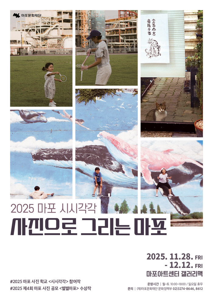 [시민일보 = 문민호 기자] 마포문화재단(대표이사 고영근)은 28일부터 12월 12일까지 마포아트센터 갤러리맥에서 <사진으로 그리는 마포> 사진전을 개최한다. 이번 전시는 ‘2025 마포 사진학교 시시각각(時時·覺·刻)프로젝트’(이하 ‘시시각각’)의 참여자들이 직접 마포 곳곳을 탐방하고 담아낸 사진 작품들과 사진 공모 <별별마포>의 수상작을 한자리에서 선보인다.