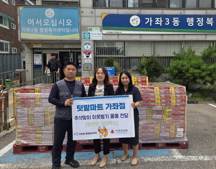 [인천=문찬식 기자] 인천 서구 가좌3동 행정복지센터(동장 박은선)는 관내 텃밭마트(대표 노형균)가 지난 22일 추석 명절을 맞아 관내 저소득층 이웃을 위해 컵라면 300박스를 지역사회보장협의체(공동위원장 이춘자)에 전달했다고 밝혔다.