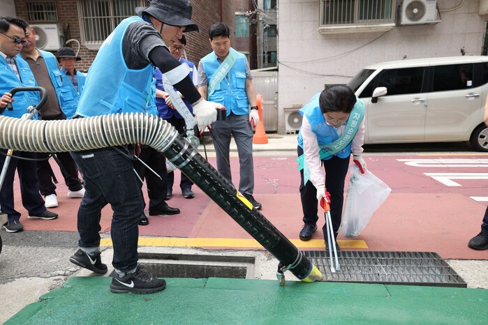 | ▲ 김미경 구청장(오른쪽)이 지난 28일 대청소 행사에서 빗물받이에 쌓인 쓰레기를 수거하고 있다. |