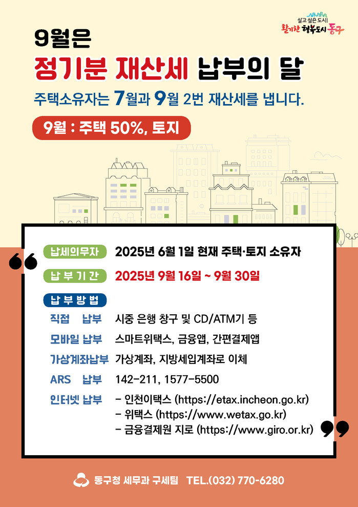 [인천=문찬식 기자] 인천 동구(구청장 김찬진)는 관내 주택소유자 등에게 2025년도 제2기분 재산세 108억원을 부과했다고 밝혔다.