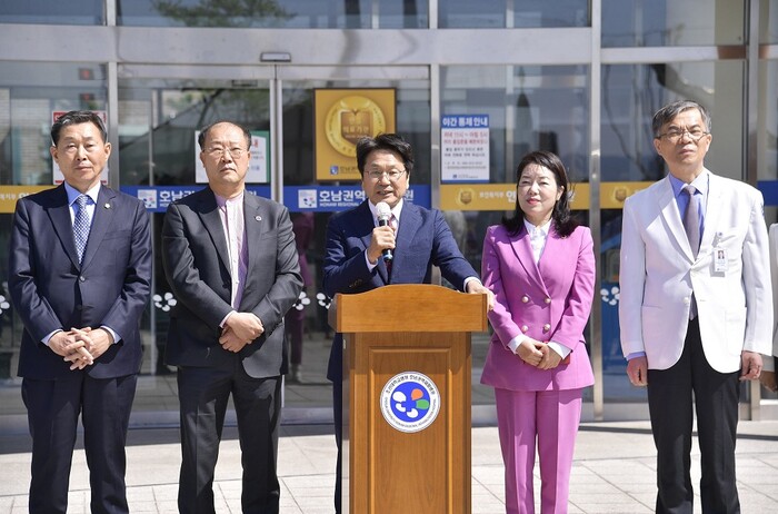 | ▲ 강기정 광주광역시장이 26일 오후 북구 본촌동 호남권역재활병원 정문 앞에서‘24시 어린이 안심병원 조성계획’을 발표하고 있다./광주광역시 제공 |