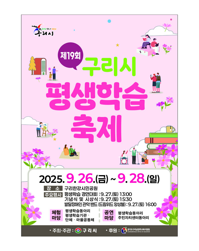 올해 축제는 ‘평생학습으로 하나 되는 즐거운 구리시’를 주제로, 남녀노소 누구나 함께 배우고 소통하며 즐길 수 있는 체험 프로그램과 경연대회 등 다채로운 행사로 구성된다. 특히 어린이부터 노년층까지 세대별 맞춤형 프로그램이 마련돼 온 가족이 함께 즐길 수 있는 축제가 될 것으로 기대된다.