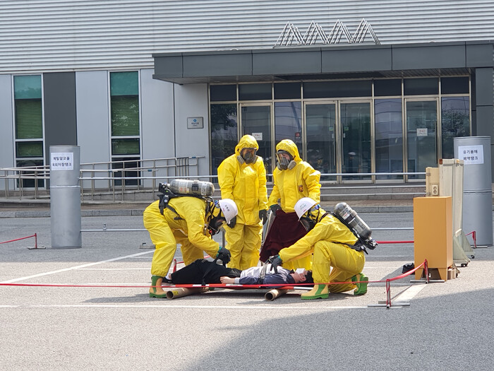 유해화학물질인 메틸 알코올 누출로 인한 화재 상황을 설정해 진행한 이 훈련은 자체 매뉴얼에 따라 ▲비상 상황 긴급전파 ▲소방대 초동 조치 ▲화재 진압 ▲인명구조 ▲사고 복구 등으로 구성됐다.
