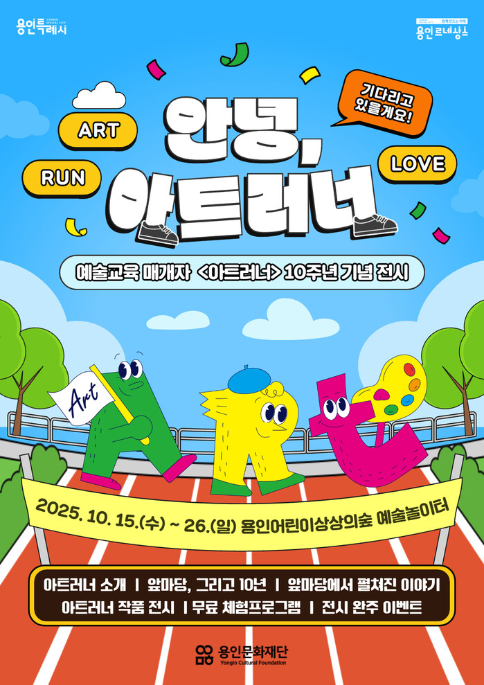 [용인=오왕석 기자] (재)용인문화재단(이사장 이상일)은 예술교육 매개자 ‘아트러너(Art Runner)’ 사업 10주년을 맞아 오는 10월 15일부터 26일까지 용인어린이상상의숲 예술놀이터에서 기념 전시 <안녕, 아트러너>를 개최한다.