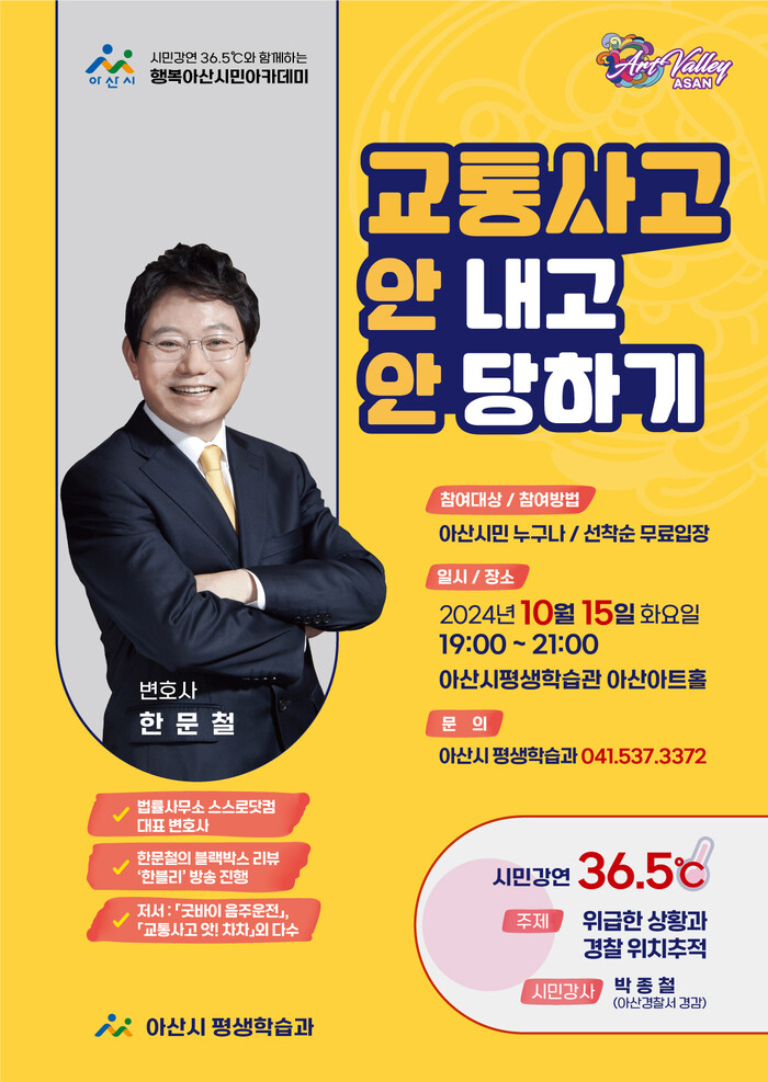 [아산=박명수 기자] 충남 아산시가 오는 15일 오후 7시 평생학습관 아산아트홀에서 한문철 변호사를 초청해 ‘행복아산 시민아카데미’를 연다.