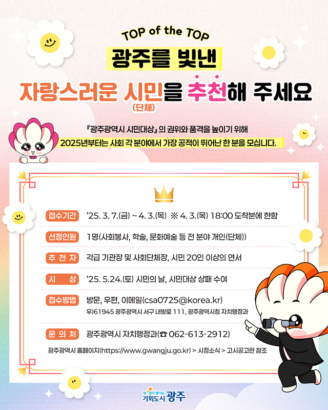 시민대상 후보자는 광주시 누리집 공고일(2월28일) 기준 3년 이상 광주시에 거주하면서 광주시의 명예와 지역발전에 공적이 있는 사람(단체)으로, 각급 기관장 또는 사회단체장, 시민 20인 이상 연서로 추천할 수 있다.