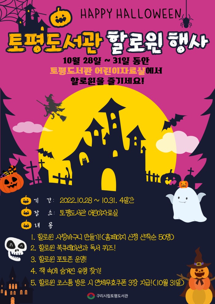 [구리=손우정 기자] 경기 구리시 토평도서관은 ‘핼러윈데이’를 맞이해 누구나 즐길 수 있는 핼러윈 행사를 어린이자료실에서 운영한다고 17일 밝혔다.