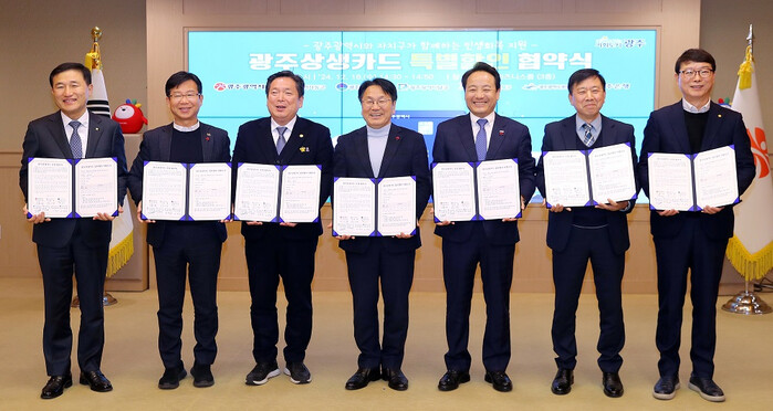 | ▲ 강기정 광주광역시장(사진 가운데)가 지난해 12월 18일 시청 비즈니스룸에서 5개 자치구, 광주은행과 함께 ‘광주상생카드 특별할인 공동추진 업무협약’을 체결한 후 기념촬영을 하고 있다. / 광주광역시 제공 |