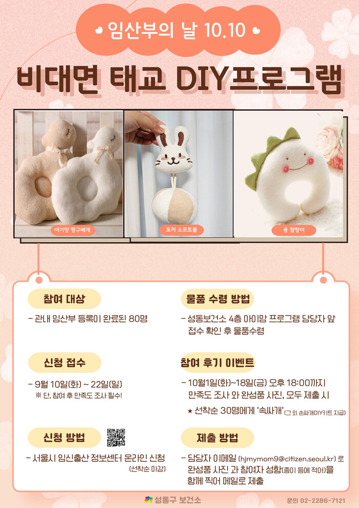 [시민일보 = 박소진 기자] 서울 성동구(구청장 정원오)가 오는 22일까지 ‘비대면 태교 DIY 프로그램’ 참가자를 모집한다.