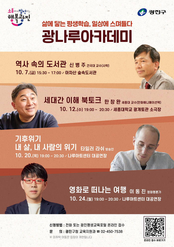 김경호 구청장은 “광진구 평생학습도시 지정을 기념으로 명사분들을 초청해 특별 강연을 마련했다”며, “많은 분들이 참여해 일상에 스며드는 풍성한 지식을 얻어가시길 바란다”고 말했다.