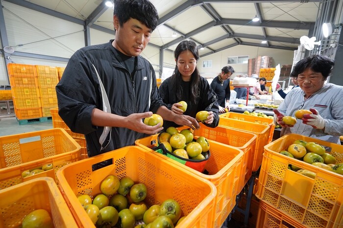 | ▲ 해남산 태추단감 재배 농가에서 수확한 단감의 품질 선별 검사를 하고 있다. / 해남군 제공 |