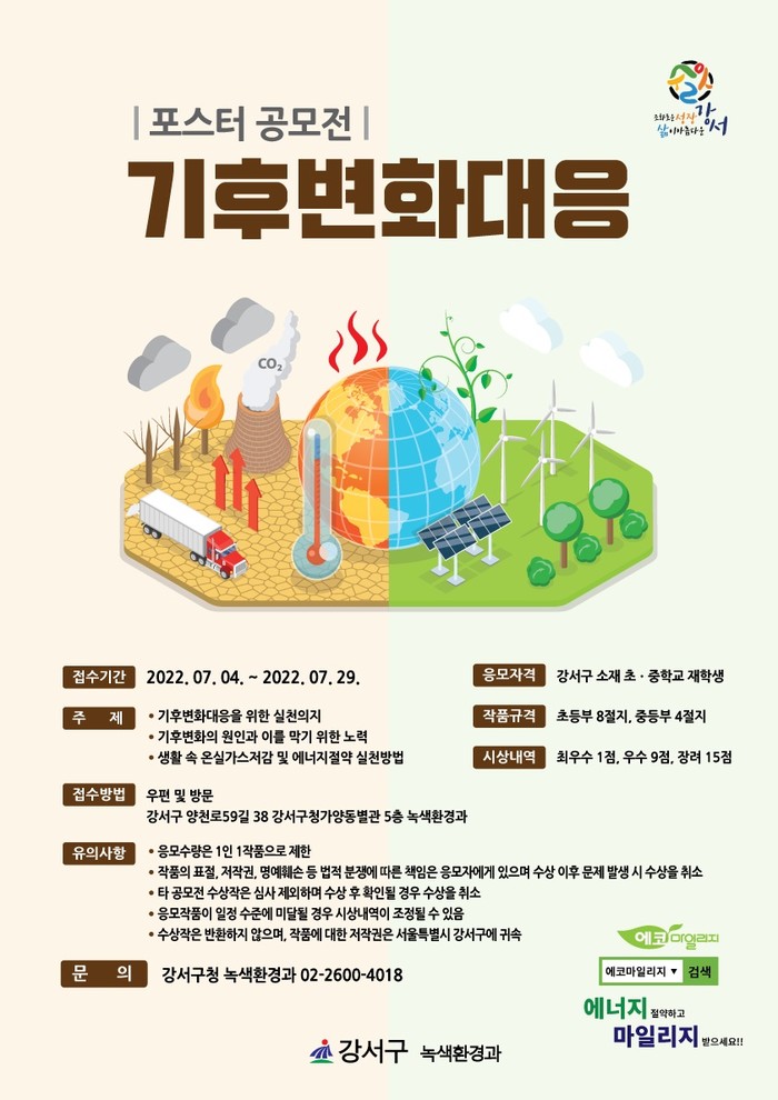 [시민일보 = 홍덕표 기자] 서울 강서구(구청장 노현송)는 지역내 초·중학생들의 기후변화에 대한 관심을 높이기 위해 '기후변화 대응 포스터 공모전'을 개최한다고 24일 밝혔다.