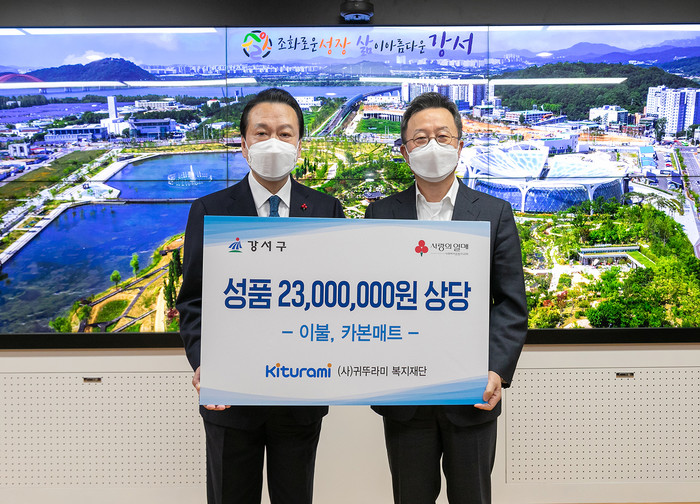 서울 강서구가 최근 (주)귀뚜라미 복지재단으로부터 저소득 주민을 위한 이불 100채·카본매트 50채 등 방한용품을 이웃돕기 성품으로 기탁받았다. 기탁받은 성품은 지역내 홀몸노인 등 저소득 가정에 전달된다. 사진은 전달식에서 노현송 구청장(왼쪽)이 송경석 대표이사 기념촬영을 하고 있는 모습. (사진제공=강서구청)