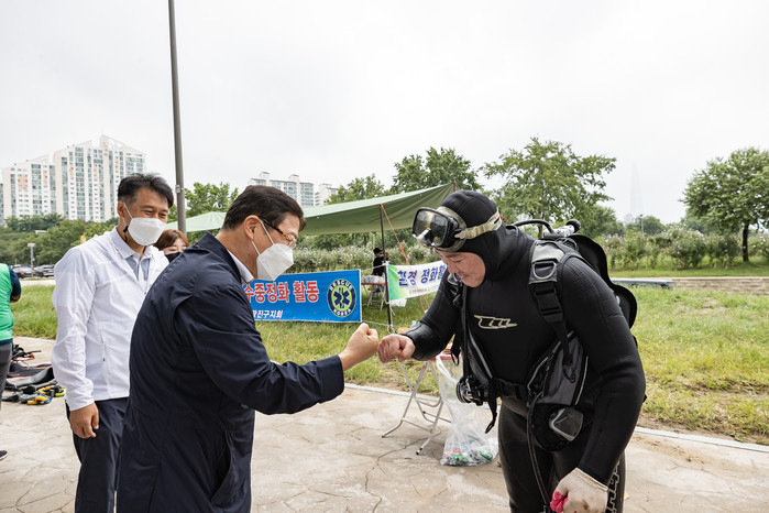 서울 광진구가 최근 상수원 보호와 한강 수질 보전을 위해 ‘한강 수중 정화 활동’을 진행했다. 사진은 최근 재난구조협회 특전사동지회 서울시광진구지회 주관으로 진행된 천호대교 남단에서 잠실대교 남단까지 ‘한강 수중 정화 활동’에서 김경호 구청장(왼쪽 두 번째)이 봉사자와 주먹악수를 하고 있는 모습. (사진제공=광진구청)