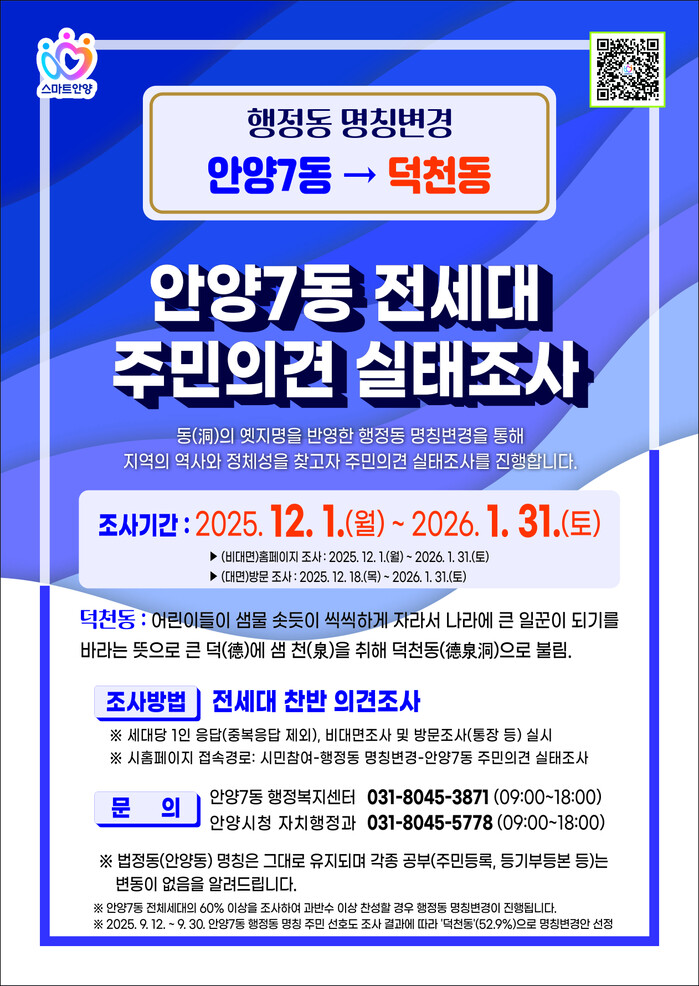 조사방법은 올해 12월 1일부터 2026년 1월 31일까지 시 홈페이지를 통해 비대면 조사를 진행하고, 12월 18일부터 2026년 1월 31일까지 안양7동 행정동명칭변경추진위원회가 각 세대 방문조사를 병행하게 된다.