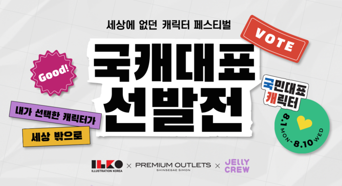 이번 ‘국캐대표 선발전’은 일러스트코리아 홈페이지와 신세계아울렛APP에서 2개의 채널로 동시 진행되며 100여명의 일러스트코리아 소속 작가와 60여명의 젤리크루 소속 작가가 함께 하며 총 3단계로 진행된다.