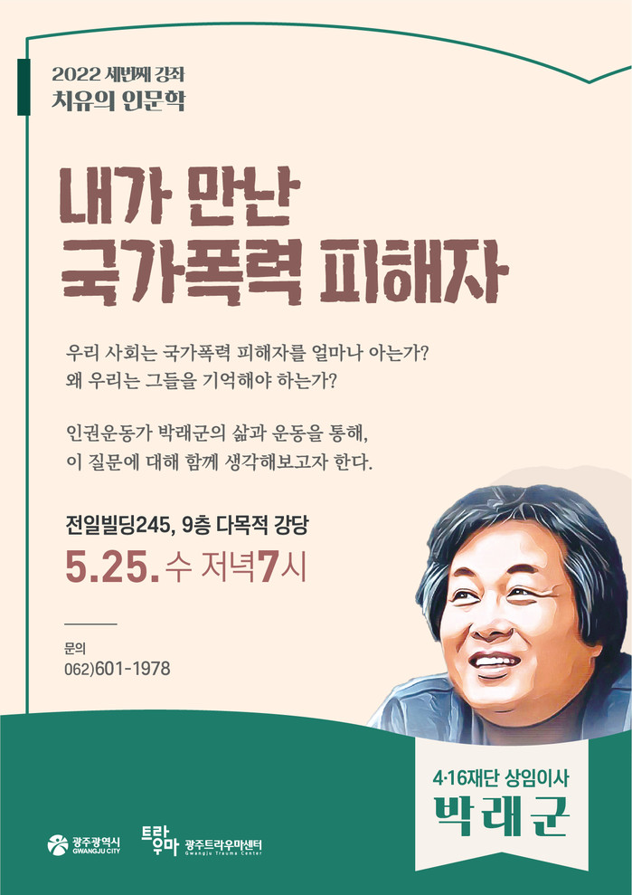 광주시는 국가폭력 피해자의 트라우마 치유와 안전한 치유공동체 조성을 위해 2013년부터 매년 ‘치유의 인문학’을 개최하고 있으며, 광주트라우마센터를 대표하는 대중 강좌로 자리매김하고 있다.