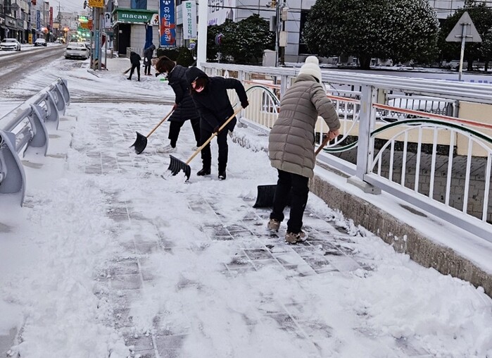 | ▲ 해남군 전 공직자들, 지난 22일부터 내린 폭설로 보행이 불편한 읍내시가지 인도에 쌓인 눈 치우기 작업을 하고 있다. / 해남군 제공 |