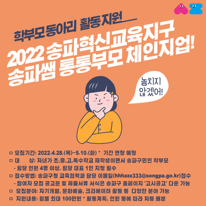 [시민일보 = 이대우 기자] 서울 송파구가 이달 말까지 2022 송파혁신교육지구 사업으로 ‘송파쌤 통통 부모 체인지업!’ 학부모 동아리 활동 참여자를 모집한다.
