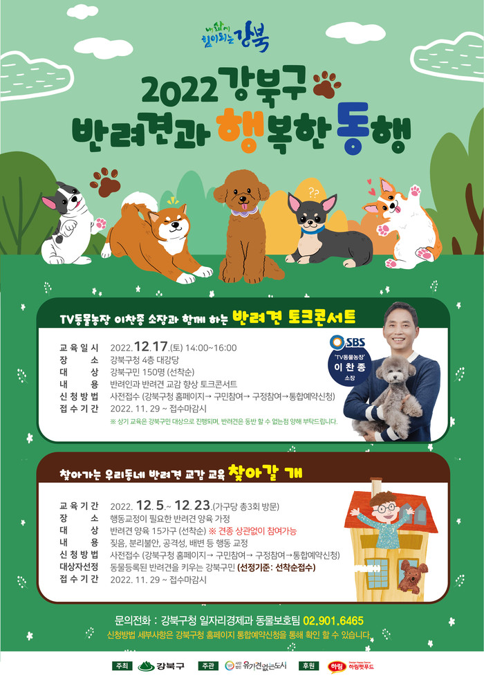 [시민일보 = 박준우 기자] 서울 강북구(구청장 이순희)가 '2022년 찾아가는 반려견 행동 교정 교육 프로그램'을 운영한다고 28일 밝혔다.