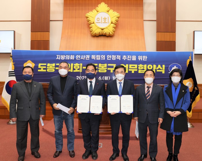 [시민일보 = 여영준 기자] 서울 도봉구의회(의장 박진식)는 최근 구의회 본회의장에서 도봉구와 '지방의회 인사권 독립'의 안정적 추진을 위한 업무협약을 체결했다고 8일 밝혔다.