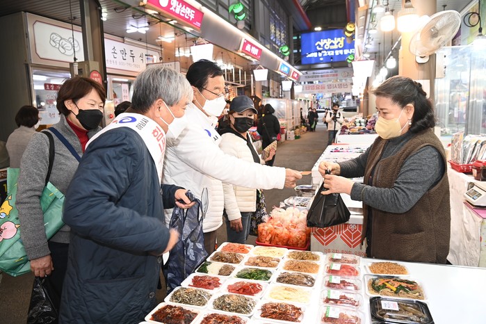 이현재 경기 하남시장이 28일 신장·덕풍전통시장 등을 방문해 상인들을 격려했다. 앞으로 매월 1회 이 시장 등이 장보기 행사를 하며 전통시장 활성화에 나설 예정이다. 사진은 이 시장(왼쪽 세 번째)이 전통시장에서 장을 보고 있는 모습. (사진제공=하남시청)