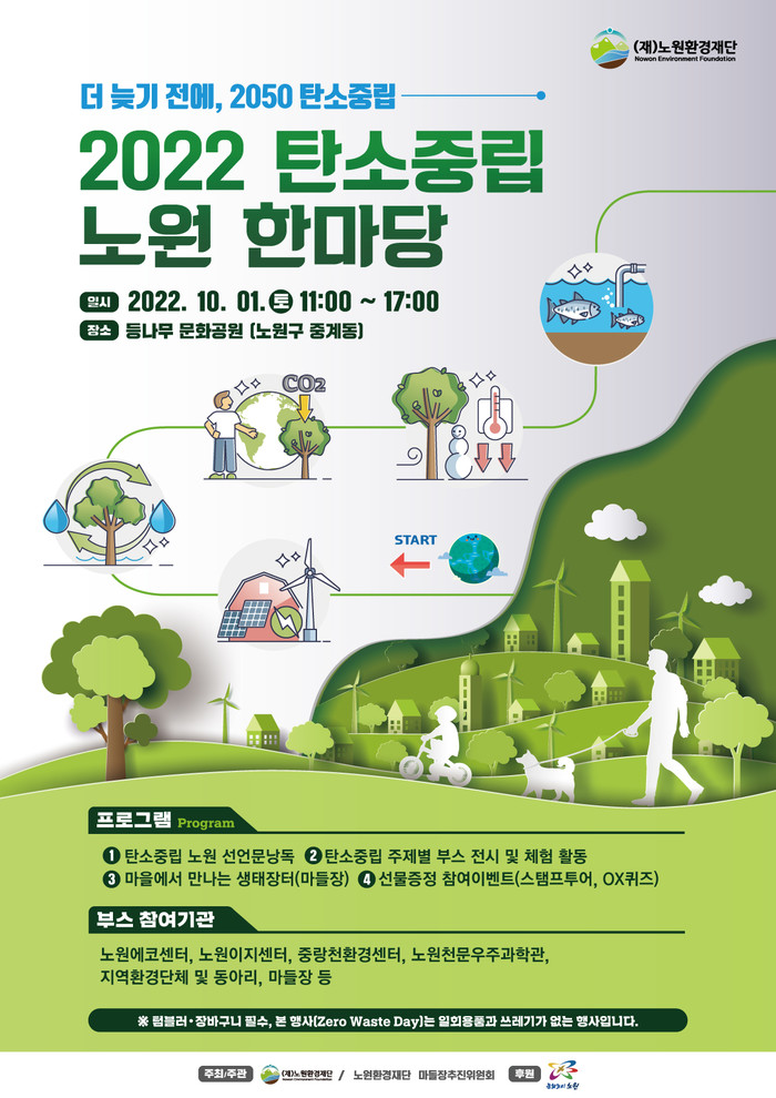 [시민일보 = 홍덕표 기자] 서울 노원구(구청장 오승록)는 오는 10월1일 중계 등나무문화공원에서 '2022 탄소중립 노원 한마당'을 개최한다고 밝혔다.