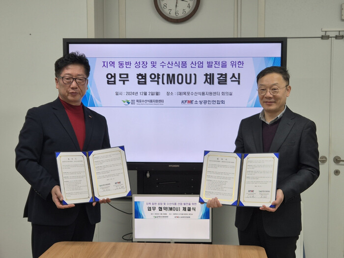 [목포=황승순 기자](재)목포수산식품지원센터(센터장 윤영승)와 목포시소상공인연합회(회장 윤도현)가 지난 2일 지역 수산식품산업 발전을 위한 상호 협력을 약속하는 업무협약(MOU)을 체결했다.