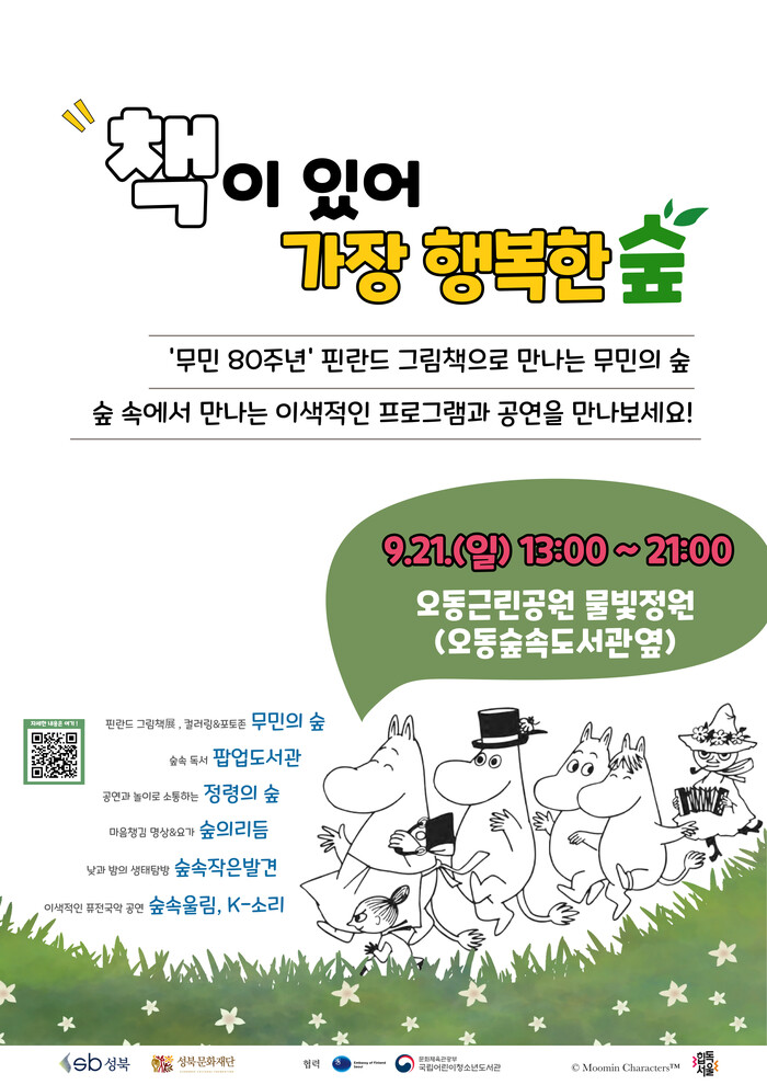 특히 핀란드 대표 캐릭터 무민의 탄생 80주년을 기념하는 특별전 '핀란드 그림책展: 무민의 숲'이 물빛정원에 꾸려진다. 주한핀란드대사관과 국립어린이청소년도서관이 협력한 이번 전시에서는 핀란드 대표 작가의 그림책과 삶의 철학을 만날 수 있으며, 무민 캐릭터 컬러링 참여 부스도 마련돼 색다른 독서문화 체험을 선사한다.