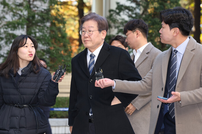 더불어민주당 이재명 대표가 21일 오전 서울 서초구 서울중앙지방법원에서 열린 '대장동 배임·성남FC 뇌물' 관련 1심 8회 공판에 출석하고 있다.