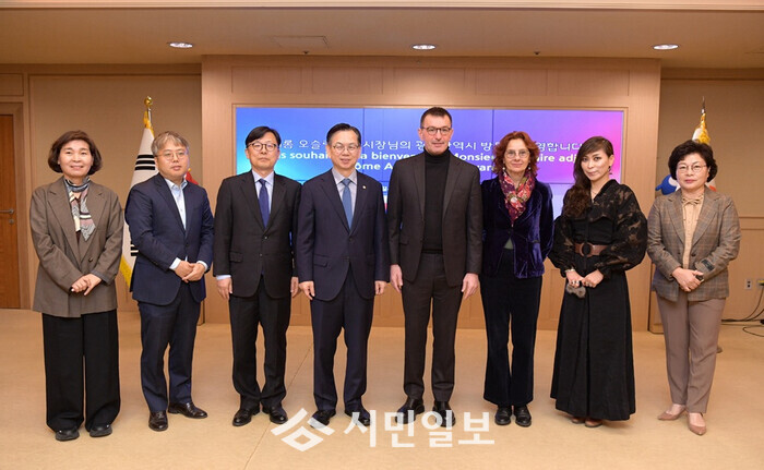 | ▲ 고광완 광주광역시 행정부시장(왼 쪽부터 네 번째)이 5일 오전 시청 비즈니스룸에서 제롬 오슬렁데 프랑스 클레르몽페랑 부시장 예방을 받고 광주시와 교류 협력 방안을 논의한 후 참석자들과 함께 기념촬영을 하고 있다. /광주광역시 제공 |