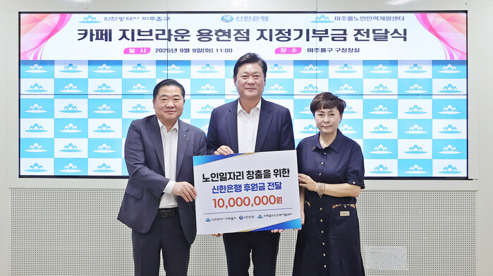 [인천=문찬식 기자] 인천 미추홀노인인력개발센터(센터장 김태화, 이하 센터)는 9일 신한은행 미추홀구청점(지점장 윤용명)으로부터 카페지브라운 용현점에 지정 후원금 1천만 원을 전달받았다.