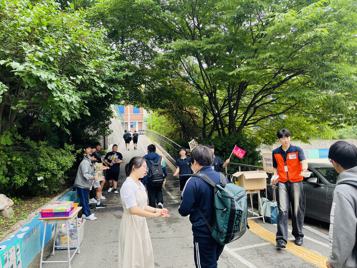이날 송도중 또래상담부 학생들은 응원 피켓을 들고 “우리가 함께할게, 친구야 힘내자!”, “너를 응원해!” 등을 외치며 친구들을 맞이했고, 교사들 역시 또래상담자와 함께 학생들에게 힘과 용기를 북돋아 줬다.