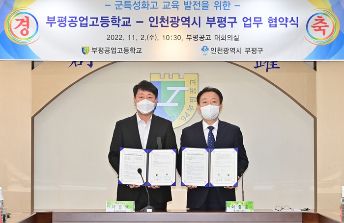 [인천=문찬식 기자] 인천 부평구가 2일 부평공업고등학교 대회의실에서 부평공업고등학교와 군 특성화고 교육 발전 지원을 위한 업무협약을 체결했다.