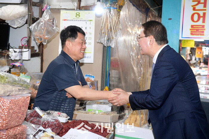 | ▲ 김영문 광주광역시 문화경제부시장이 4일 오전 남광주시장을 방문해 상인들의 애로 및 건의사항을 청취하고 있다. /광주광역시 제공 |