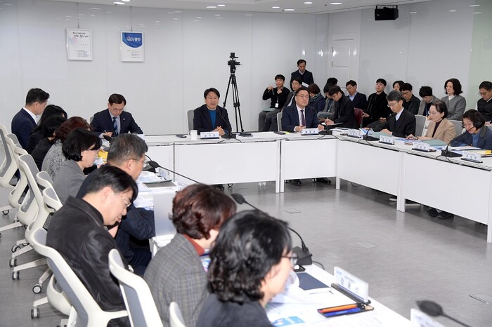| ▲ 강기정 광주광역시장이 15일 오전 시청 소회의실에서 열린 '2024년 복지분야 업무보고회'에서 관련 정책을 논의하고 있다./광주광역시 제공 |