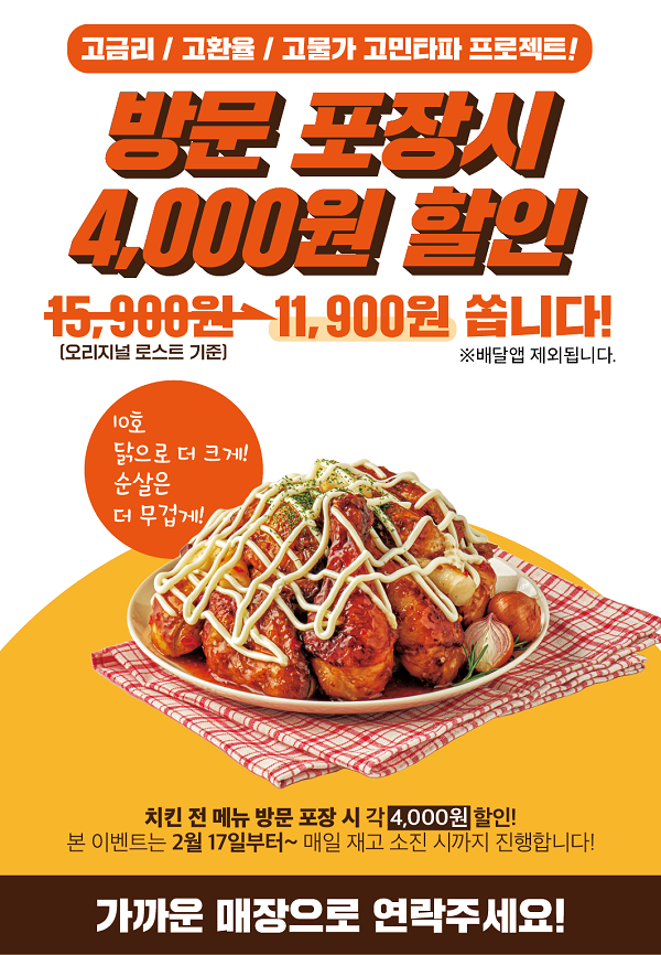 고민타파 본 이벤트의 내용은 포장시에만 할인 적용이 가능하며 가격과 상관없이 치킨 한 마리당 구매 가격을 4,000원씩 할인을 진행한다.