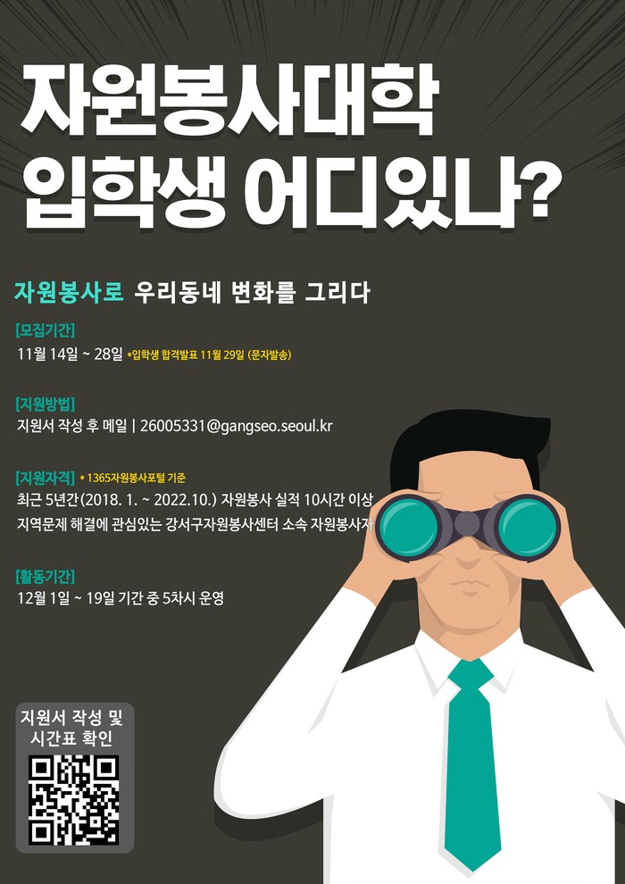 참여를 희망하는 자원봉사자는 오는 28일까지 강서구 자원봉사센터 홈페이지에 게시된 QR코드(네이버 폼)를 통해 신청하거나, 신청서를 전자우편(26005331@gangseo.seoul.kr) 또는 구 자원봉사센터에 직접 제출하면 된다.