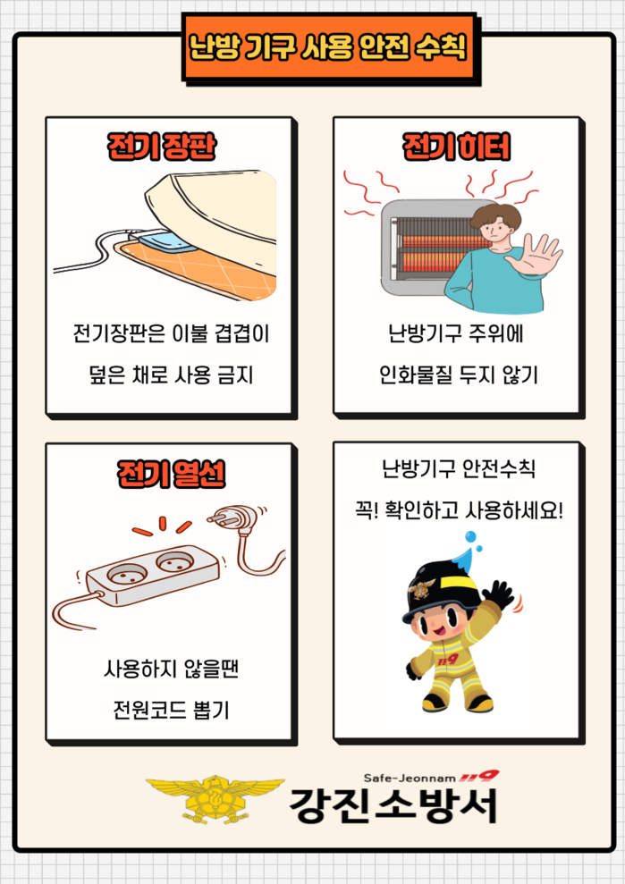 | ▲ 겨울철 난방기구 사용 3가지 안전 수칙 준수 홍보 이미지 / 강진소방서 제공 |