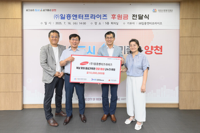 서울 양천구가 16일 (주)일흥엔터프라이즈로부터 복날 맞이 효심가득한 건강 밥상 나누기 후원 성금으로 1000만원을 기부받았다. 사진은 이기재 구청장(오른쪽 두 번째)이 관계자들과 기념 촬영을 하는 모습. (사진=양천구청 제공)