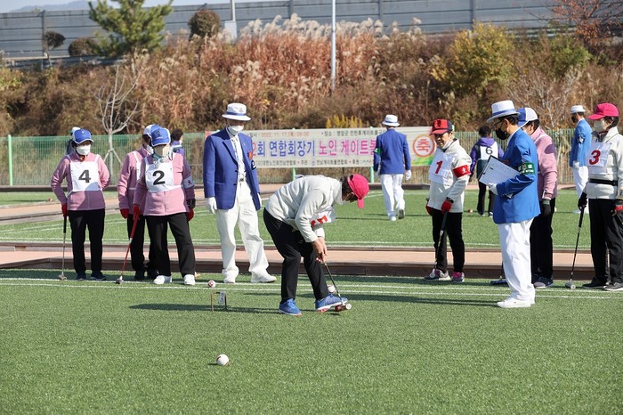 | ▲ 지난 17일 영암군노인게이트볼장에서 열린 제22회 전남 연합회장기 노인게이트볼 대회에서 참가선수가 볼치기를 하고 있다. / 사진=영암군 제공 |