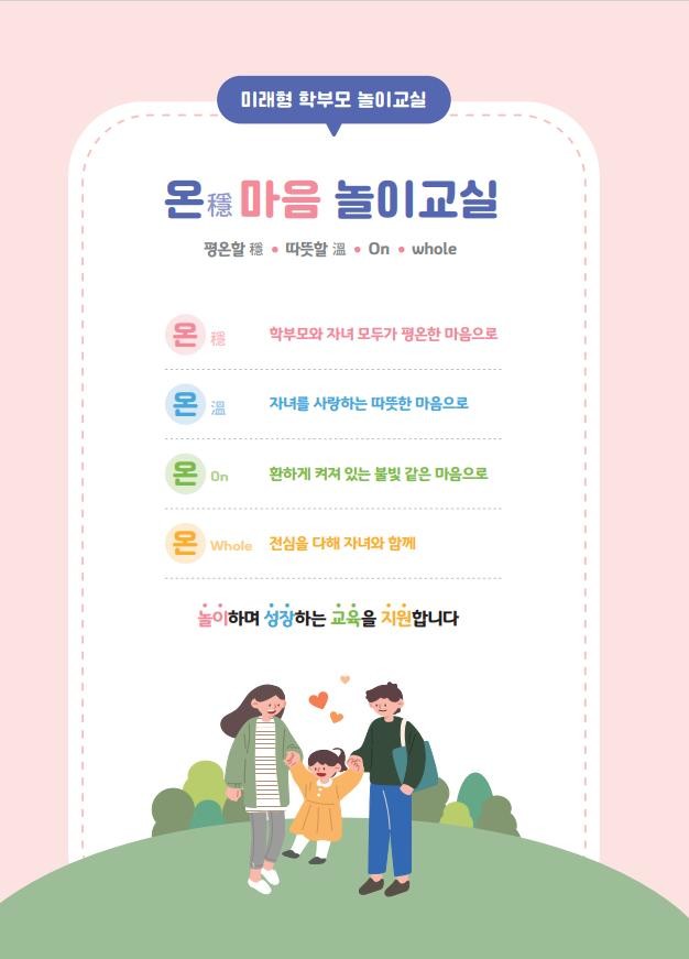 온(穩)마음 놀이교실 내용은 학부모가 유아의 심리·정서를 이해하고 일상생활 속에서 놀이를 통해 유아의 건강한 성장과 발달을 지원할 수 있는 놀이를 담아서 ▲학부모·자녀 마음 알기 ▲학부모·자녀 마음 잇기 ▲학부모·자녀 마음 넓히기 등 3가지 영역으로 구성했다.